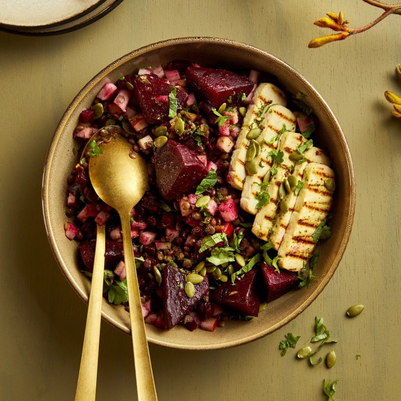 Bekijk meerEen heerlijke maaltijd die even wat anders is dan anders; een gezonde vegan bowl met bietjes, feto (gefermenteerde tofu), pompoenpitten en appel. Maak je af met een heerlijke dressing van verse kruiden zoals peterselie, munt en koriander, knoflook, rode wijnazijn en chili. Bereidingstijd: 45 minuten