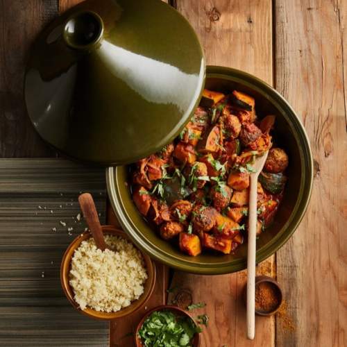 Geen inspiratie voor een gezonde maaltijd? Wij helpen jou de goede voornemens vol te houden met deze tajine met groenten, kikkererwten, olijven, rozijnen, kaneel en komijn. Heerlijk met (volkoren) couscous of naanbrood. Ook lekker zonder merquez worst. Voeg dan wat extra kikkererwten toe.