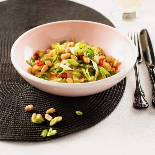 Bekijk meerEen heerlijke Aziatisch bijgerecht met bimi, avocado, veldsla, bosuit, peper en dressing van gembersiroop, tamari en olie.