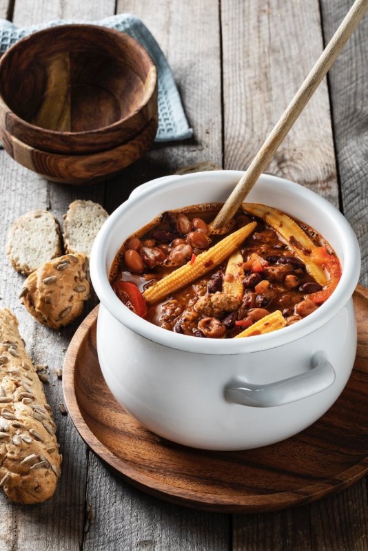 - Voeg de tomatenblokjes, reepjes paprika, bonen en de bouillon toe en breng aan de kook. Laat circa 5 min koken.