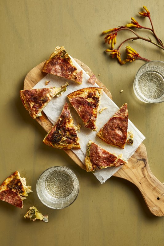 - Bedek de bodem van een ovenvaste koekenpan met plakjes salami en bak 2 minuten totdat het vet vrijkomt. Giet het aardappel-eimengsel erover en zet het vuur laag. Laat rustig bakken totdat het mengsel aan de zijkant begint te stollen.