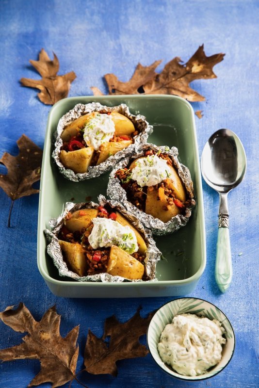Gevulde gepofte aardappels met gekruid gehakt