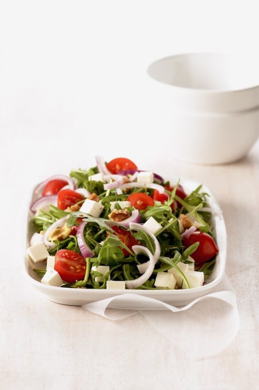 - Leg de feta, tomaatjes, rode ui en walnoten op de salade en serveer meteen.