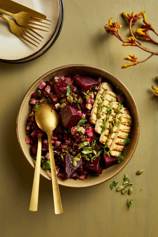 - gedroogde groene linzen (kies voor gegarandeerd glutenvrij indien gewenst) 150g gekookte bietjes 500g, de helft in kleine blokjes en de andere helft in grote blokjes