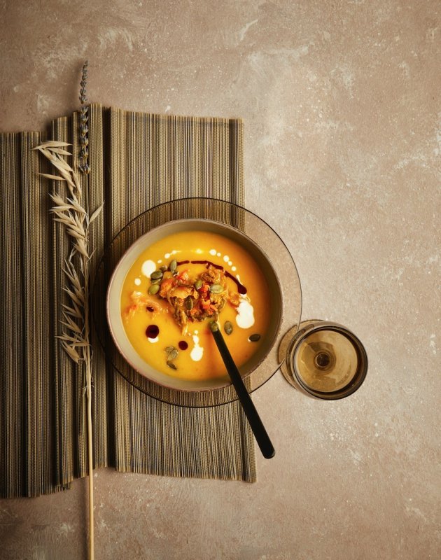 - Pureer met de staafmixer glad, breng op smaak met zout en peper en eventueel nog wat chili. Top met sojacuisine, pompoenpitolie en -pitjes en een schep kimchi.