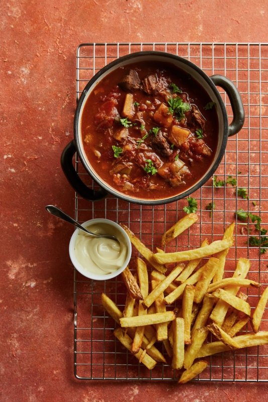 - Serveer de stoof met de frieten en geef er mayonaise bij.