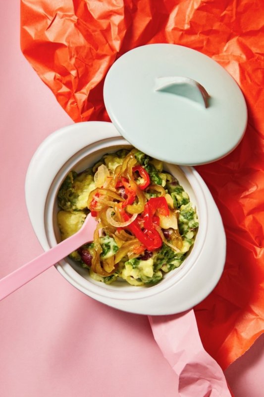 - Roer de kidneybonen, spinazie en kaas door de puree en warm het geheel goed door.