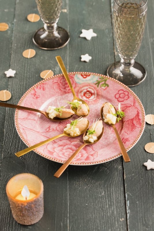 - Schep een lepeltje tonijncrème op toastjes of mooie lepels. Garneer met appelvinaigrette en tuinkers.
