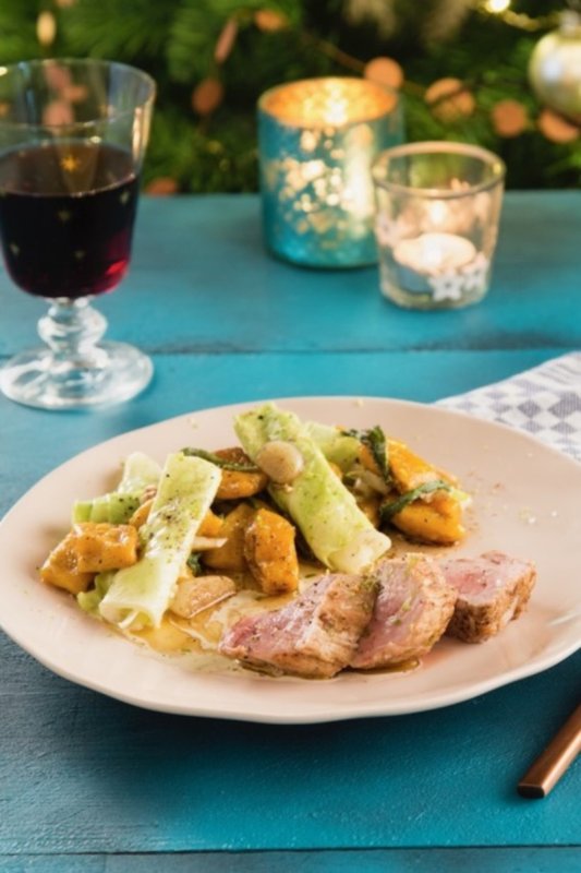 - Snijd de varkenshaasjes na de rusttijd in medaillons (overdwars) en verdeel over de warme borden. Serveer met de koolrolletjes, gnocchi, bakboter, peper en zout en wat citroenrasp.