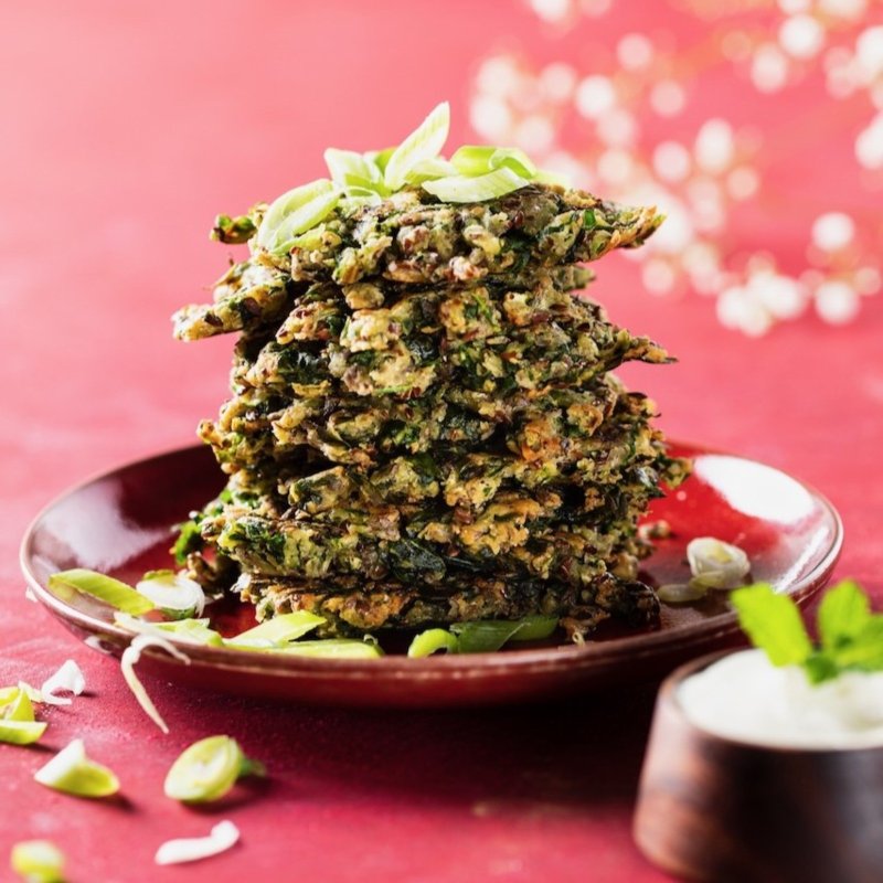 Bekijk meerWil je iets lekkers bij je borrel of een gezonde alternatief voor friet of aardappelkroketjes? Maak dan deze rösti van courgette, spinazie, verse munt, lijnzaad en wat zure (vegan) room. In slechts 15 minuten klaar!