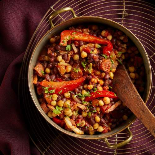 Bekijk meerEen heerlijk pannetje voedzaam eten vol smaak om van te genieten op de laatste gure dagen. Heerlijk met (vegan) chorizoworst, (vegan) spekjes, tomaat, paprika, tijm, sinaasappel, kikkererwten en bonen. Bereidingstijd: 30 minuten