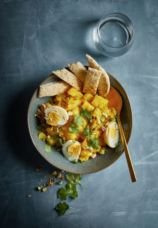 - Serveer (naar wens) met een gekookt eitje en naanbrood en garneer met de overgebleven noten en koriander.