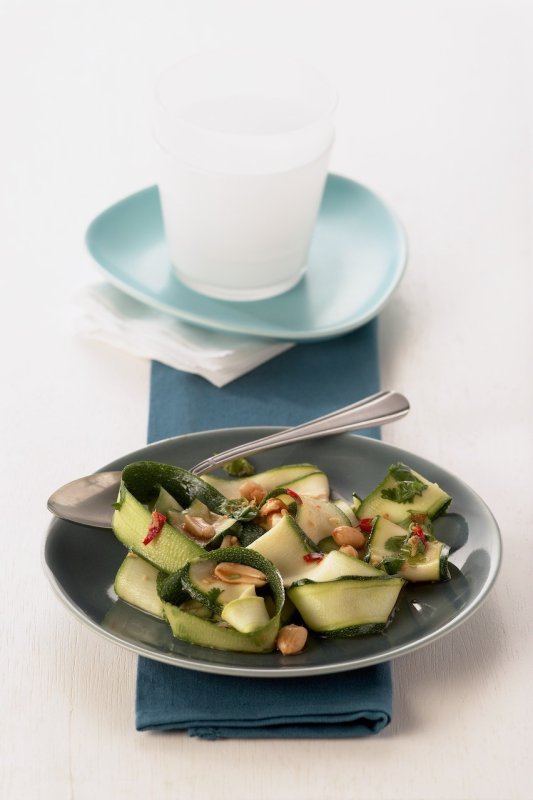 - Leg de courgetterepen erin en schep alles goed om. Laat ± 1 uur marineren en verdeel over 4 borden.