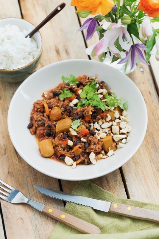 Garneer de stoofpot met flink veel cashewnoten en koriander en geef de rijst erbij.