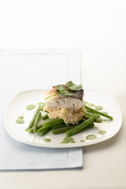 Gebakken kabeljauw met waterkerssaus en sperziebonen