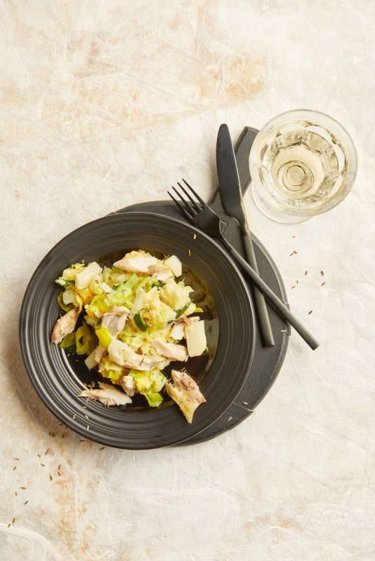 Knolselderij-preistamppot met gerookte makreel