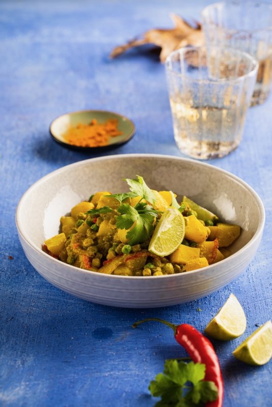 - Garneer de curry met het korianderblad en serveer de limoenpartjes erbij. Lekker met naanbrood!