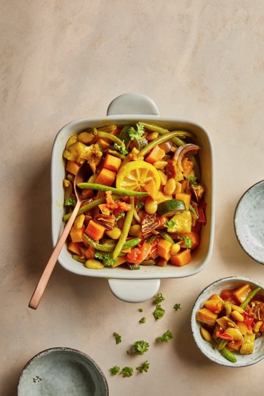 - Doe de bonen, dadels, pompoenblokjes, amandelen, courgette, citroen, tomaten en bouillon erbij en laat het, met de deksel erop, rustig stoven. Breng op smaak met zout en peper en roer af en toe door. Voeg wat extra water toe als het te droog wordt.
