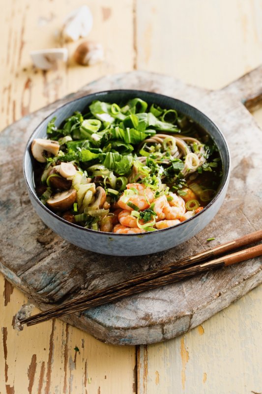 - Voeg, kort voordat je gaat serveren, de garnalen, noedels en het groene gedeelte van de paksoi toe aan de bouillon.