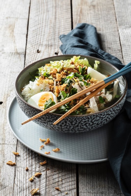 - Top met rijst, paksoi, taugé, peterselie en ei. Bestrooi tot slot met de gebakken uitjes.