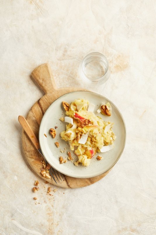 - Kook de aardappels gaar, giet af en stoom ze kort droog. Snijd de witlof in reepjes en voeg die samen met de appels, groene olijventapenade en amandelmelk toe aan de aardappels. Stamp het door elkaar en breng op smaak met zout en peper.