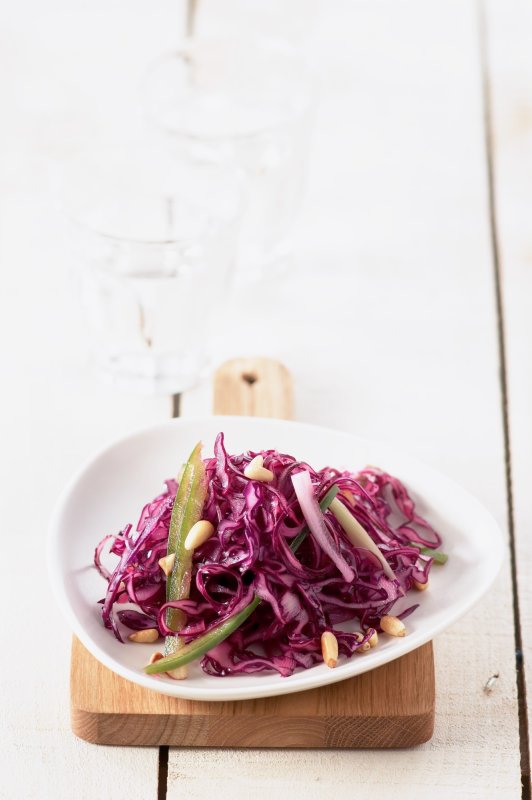 - Meng de paprika, ui, bleekselderij en pijnboompitjes door de rode kool en sprenkel de dressing erover.