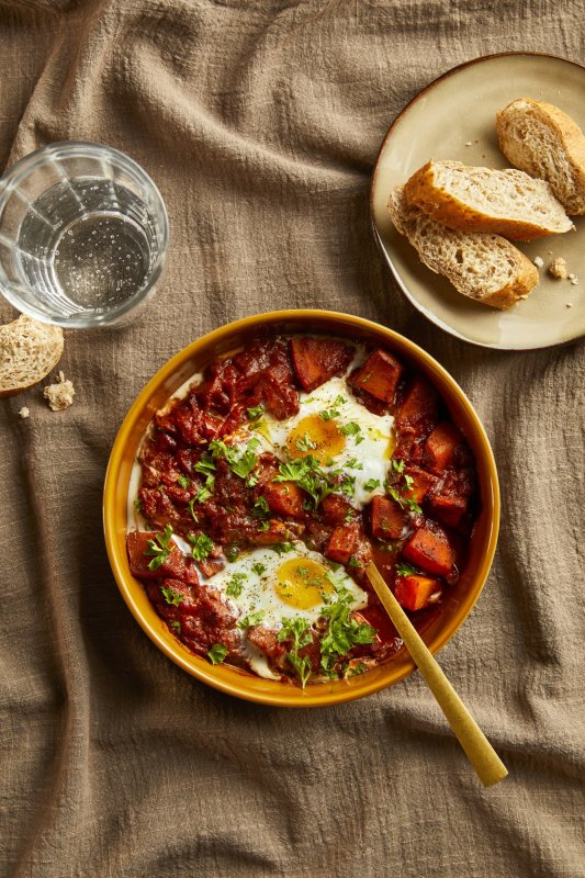 - Maak kuiltjes in het tomatenmengsel met de achterkant van een lepel en breek de eieren hierin. Dek af en laat nog 5-7 minuten zachtjes koken tot het eiwit net is gestold.