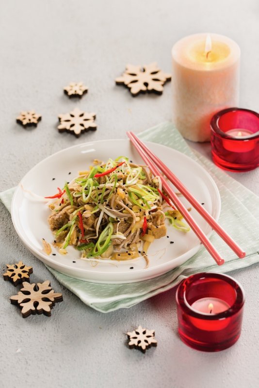- Verdeel de noodles over 4 borden en schep de geroerbakte witlof erop. Garneer met bosui en het nigellazaad. Serveer de mandarijnsalade er apart bij.