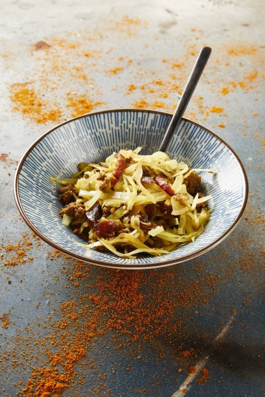 - Fruit de uien en bak het gehakt rul. Voeg de kurkuma, abrikozen en tot slot de witte kool toe en laat nog even droogstromen.